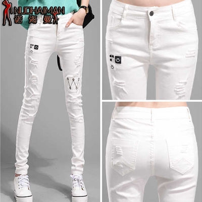 Celana Panjang Desain Lubang Warna Putih Bahan Jeans Tipis Untuk