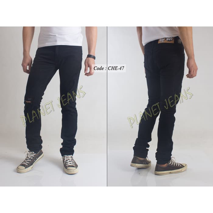 Celana Jeans Pria Sobek Robek Lutut Warna Hitam Polos Cowok C 47