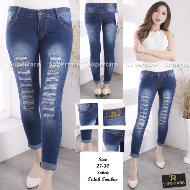 Celana Jeans Cewek Sobek Ripped Bawah Pinggang Supertara Model
