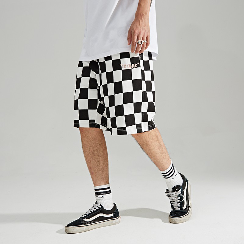 Chinism Celana Pendek Motif Kotak Kotak Papan Catur Bordir Tulisan