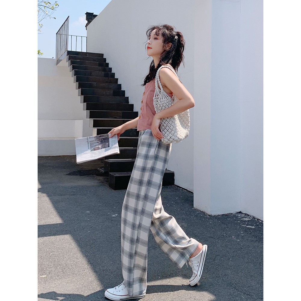 Celana Kotak Kotak Versi Korea Perempuan Longgar Celana Musim