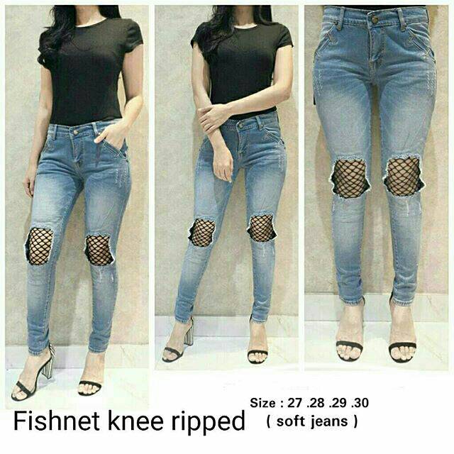 Celana Jeans Wanita Fishnet Knee Ripped Sobek Dengkul Jaring