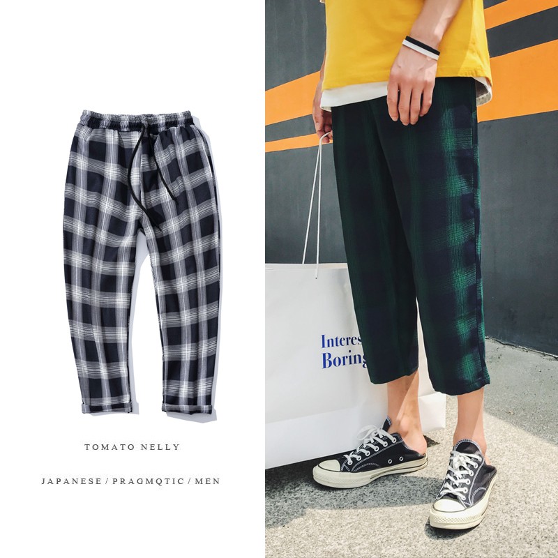 Busana Pria Korea Longgar Balok Harem Kotak Kotak Peregangan